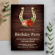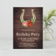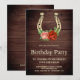 Surpreenda seus convidados com este convite de aniversário elegante com uma linda ferradura vintage decorada com flores antigas contra um fundo de madeira de celeiro rústico. Basta adicionar os detalhes do evento neste modelo fácil de usar para torná-lo um convite único.