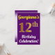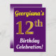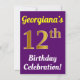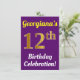 Este design convite de aniversário apresenta uma mensagem como "A Celebração de Aniversário do 12 de Georgiana!", onde o nome pode ser personalizado, e onde o número "12" tem uma aparência falsa de ouro. Ele também apresenta um fundo de cor púrpura. Os detalhes do evento no verso podem ser personalizados. Poderia ser usado para convidar pessoas para a décima segunda festa ou festa de aniversário de alguém. [~Z0000121]