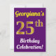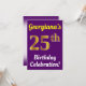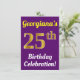 Este design convite de aniversário apresenta uma mensagem como "Georgiana's 25 de Birthday Celebration!", onde o nome pode ser personalizado, e onde o número "25" tem uma aparência falsa de ouro. Ele também apresenta um fundo de cor púrpura. Os detalhes do evento no verso podem ser personalizados. Poderia ser usado para convidar pessoas para a festa ou festa de aniversário de alguém do vigésimo quinto aniversário. [~Z0000121]