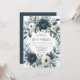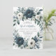 Um casamento sofisticado com um marinho azul-d'água, coroa corada floral, enfeitado com peonias, rosas e verde eucalipto em tons de azul marinho, verde e marfim. A design é aprimorada por uma caixa de cinza prateada, impressa abaixo da coroa, com layout de texto de fonte moderno. O verso do convite continua o tema com arranjo floral correspondente para um olhar coeso e elegante. Perfeito para casais que buscam eterno e papelaria de casamento clássico.