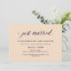 Esses convites elegantes para festa após o casamento apresentam um fundo rosa suave e caligrafia azul-marinho elegante para um visual moderno minimalista.