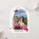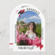 Convite de festa de formatura em forma de arco bonito com arcos e detalhes de fita vermelho-giro, fontes pretas vermelhas e cruzadas, e a foto de sua filha. Convite para festas de formatura femininas e anúncio de graduação em um deles, personalizado com a foto em forma de formando no cobrir e convite de festas no verso com detalhes fofos de arco em vermelho, o boné de formatura adorava um grande arco vermelho.