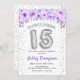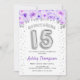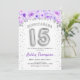 Convite para comemoração da Quinceanera. Design elegante em prata brilhante com sotaque floral. Convide cartão com balões prateados número 15, fonte de script com confetti. Roxo, branco. Perfeito para uma comemoração de na moda 15. Envie-me uma mensagem se precisar de idade personalizada.