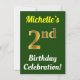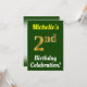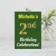 Este design convite de aniversário apresenta uma mensagem como "A Celebração do segundo aniversário da Michelle!", onde o nome pode ser personalizado, e onde o número "segundo" tem uma aparência falsa de ouro. Ele também apresenta um fundo de cor verde. Os detalhes do evento no verso podem ser personalizados. Pode ser usado para convidar pessoas para a festa ou festa de aniversário de alguém do segundo aniversário. [~Z0000121]