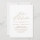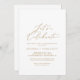 Este delicado convite para comemorar vamos de caligrafia em ouro é perfeito para uma festa de noivado moderna, casamento após festa, aposentadoria, graduação ou qualquer evento feliz. A design romântica minimalista apresenta uma magnífica e elegante tipografia amarela ouro champanhe num fundo branco com um aspecto simples e limpo.