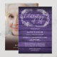 Um convite de celebração de vida elegante e rústico, com uma grinalda de folhagens desenhada à mão sobre um fundo de painéis de madeira roxa e uma foto especial no verso. Criado por Thisisnotme