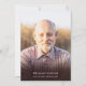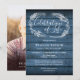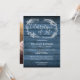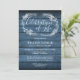 Um convite de celebração de vida rústico e elegante com uma guirlanda de folhagem desenhada à mão sobre um fundo de painéis de madeira azul com uma foto especial no verso. Criado por Thisisnotme©