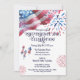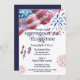 "Celebração do Dia da Independência" com uma bandeira de acendimento e fogos de artifício em aquarelas. Fundo branco com texto azul escuro na frente e fundo azul escuro na parte de trás.