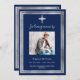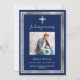 Um elegante, moderno, simples funeral/celebração do programa de vida. Um fundo azul marinho decorado com uma cruz falsa de prata e quadros falsos de prata. Personalize e adicione um nome de foto e detalhes. Texto branco.