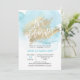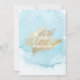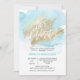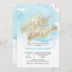Envie estes convites para chuveiros de bebês, modernos, mas elegantes. Cor de água azul clara pastel em fundo branco. Escoamento de pincel de ouro com Celebração de Vamos! A parte de trás da carta tem sobrenome bebê. Cartões editáveis - personalize-os adicionando seu texto. Perfeito para qualquer tema de festa de chá de bebê.