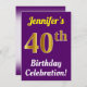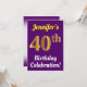 Este design convite de aniversário apresenta uma mensagem como "Celebração da aniversário de 40 anos de Jennifer!", onde o nome pode ser personalizado, e onde o número "40º" tem uma aparência falsa de ouro. Ele também apresenta um fundo de cor púrpura. Os detalhes do evento no verso podem ser personalizados. Poderia ser usado para convidar pessoas para a festa ou festa de aniversário de alguém do quadragésimo aniversário. [~Z0000121]