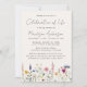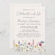 Convide amigos e família para celebrar a vida de seu amado com este convite para o funeral Elegante da Celebração da Vida em creme. O design apresenta um script preto manuscrito com os detalhes importantes do evento abaixo em letra de serif. Um belo campo de flores silvestres e folhagem de cor d'água na parte inferior do design em tons vibrantes de rosa, amarelo, roxo, azul e verde contrastando com um fundo creme claro. As flores silvestres são perfeitas para eventos memoriais de primavera e verão.