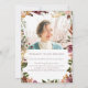 Este é um cartão memorial rústico e boêmico, usando uma moderna design de flores autóctones e folhagem. A paleta de cores apresenta cores de queda ricas como burgundy, laranja queimada, terracota, verde profundo, baga e ouro. Entre em contato com o designer para obter informações sobre este design ou sobre os produtos correspondentes necessários. Este cartão memorial pode ser facilmente personalizado com a sua própria fotografia e texto para criar um tributo especial para o funeral, memorial ou celebração da vida do seu ente querido usando o modelo fornecido.