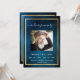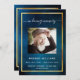 Um céu azul como fundo, uma falsa estrutura dourada. Personalize e adicione uma foto, nome, datas e texto. Texto branco.