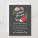 Elegant and modern holiday cocktail party invitation features a beautiful watercolor winter greenery wreath with anemone, poinsettia flowers. rose pink berries, and leaves. Stylish white text includes a "Celebrate the Season" title and custom text that can be completely personalized for your Christmas party event. A coordinating floral pattern dresses up the back side of the card. Dark charcoal gray background color contrasts the red, green, pink, and white design.