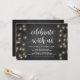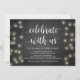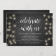 Linda Celebre conosco, Anúncio de Casamento Fugitivo / Cartão de Convite para Festa, com Luzes de Corda Rústicas Modernas, tema de Quadro Negro. Isto é perfeito para o seu casamento e festa de celebração pós-casamento. Adicione seus detalhes em fonte / letra correspondente.