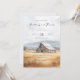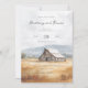 Este convite de casamento apresenta um tema pastoral sereno com uma ilustração em estilo aquarela de um celeiro rústico colocado contra colinas onduladas. A paleta de cores inclui azuis suaves, cinzas e tons terrosos, criando uma atmosfera calma e convidativa. Fontes script e serif elegantes são usadas para o texto, que é organizado em um layout centralizado para melhorar a legibilidade. O design captura a essência de um ambiente rural com sua representação realista e estilizada, tornando-o perfeito para casais que buscam uma estética charmosa e simples para o seu dia especial.