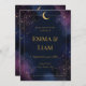 Convite Celestial Escuro para Casamento | Nuvens roxas e Marinhos, Douradas estrelas e lua Convidem seus hóspedes para uma noite debaixo das estrelas com este convite de casamento celestial escuro, com marinhos profundos e nuvens de aquarela roxas iluminadas por constelações de ouro, estrelas cintilantes e uma lua crescente brilhante. Enquadrada por uma clássica fronteira dourada, esta design romântica captura a magia do céu noturno. Perfeito para casamentos celestiais, boho ou elegantes à noite. Um modelo totalmente personalizável permite que você adicione seus nomes, data e detalhes de casamento para um toque pessoal.