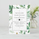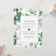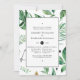 Convite de jantar de ensaio de casamento moderno com folhas de praia tropicais verdes e um padrão geométrico preto e branco.