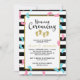Convite para cerimônia de nomeação para irmãos gêmeos com pegadas em ouro, rosa e azul espalhadas sobre um fundo listrado preto e branco. A cerimônia de nomeação é escrita em um roteiro encantador. Adicione os nomes dos seus gêmeos e os detalhes da cerimônia de nomeação.