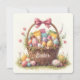 Linda cesta de Páscoa repleta de ovos coloridos, flores de primavera e uma fita rosa, perfeita para decorações festivas e cartões.