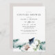 Este convite para chás apresenta elementos oceânicos de cor d'água, incluindo coral e uma arraia manta, com um layout simples e moderno. Este convite pode ser usado para qualquer evento, mas é perfeito para seu evento de chá de panela tropical ou de praia.