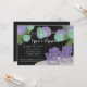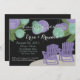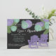 Lanternas de papel roxo e verde sobre cadeiras de adirondack, convite para chás de casal para o tema da praia.