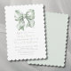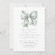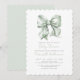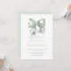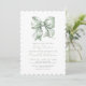 Um Convite de Chuvada de Bebê com Laço Verde Sage Neutro em Gênero. Este design elegante apresenta um laço verde sage suave em aquarela na frente, complementado por um fundo verde sage correspondente no verso. O texto é estilizado em uma mistura de fontes serif clássicas e caligrafia delicada, criando uma estética refinada, porém acessível.
