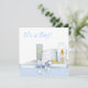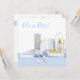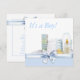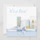 Convite de chá de bebê menino amarelo e azul adorável com itens de berçário envoltos em laço azul doce, blocos de bebê, fraldas, patinho amarelo de borracha, mamadeira e pó. Adicione seus detalhes na frente e/ou atrás simplesmente escolhendo o botão laranja "Personalize!" para começar a adicionar os detalhes do seu evento, estilo de fonte, tamanho e cor da fonte e texto.