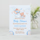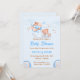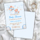 Este convite de chá de bebê apresenta um design suave e pastel com um ursinho de pelúcia fofo flutuando entre balões azuis e marrons. Rodeado por nuvens e estrelas, o ursinho cria uma atmosfera sonhadora e caprichosa. Arcos azuis decoram os cantos inferiores, adicionando um toque divertido ao convite.