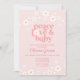 Convite de chá de bebê rosa e dália inspirado no estilo retrô Paz Amor e Bebê com dálias e fontes e cores estilo anos 70.