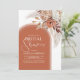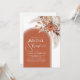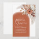 Esses convites de chá de noiva boho sonhadores são perfeitos para um casamento de outono. Os convites apresentam um tema boho com tons de laranja queimado, terracota, pêssego e creme. Uma exibição elegante de flores, folhas, grama pampas e um modelo de convite de chá de noiva moderno sobre arcos com tons terrosos.