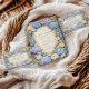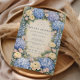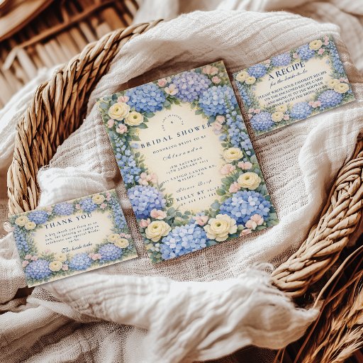 Um design de chá de panela inspirado em um jardim romântico, apresentando hidrângeas azuladas exuberantes combinadas com rosas marfim suaves e delicadas flores de campo. As flores enquadram a composição em uma elegante disposição simétrica com detalhes clássicos sutis, criando uma estética refinada e atemporal. O fundo bege quente realça a suavidade da paleta azul, mantendo um visual gracioso e sofisticado. Perfeito para uma celebração sofisticada com uma elegância fresca de jardim.