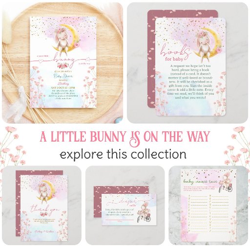 Um belo coelhinho está a caminho. Design feito para o Chá de fraldas de uma garota com aquarela rosa, ilustrações delicadas de flores e um belo coelhinho!