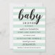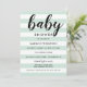 Este convite de chá de bebê chic e moderno apresenta um texto em letra cursiva negrito "bebê" combinado com listras horizontais limpas em verde menta e branco para um visual fresco e neutro em termos de gênero. O texto em azul escuro proporciona um contraste nítido em todo o design. O padrão de listras gráficas simples faz uma declaração elegante para qualquer celebração de chá de bebê. Todo o texto é totalmente personalizável para o seu evento.