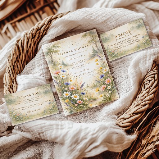 Um design de prado em aquarela suave com delicadas margaridas, cosmos rosa, centáureas azuis e flores amarelas alegres reunidas em um arranjo fresco de primavera. As flores surgem naturalmente da parte inferior do layout, criando uma composição arejada e aberta com um fundo de pergaminho quente. Leve, romântico e elegantemente descomplicado, este design captura o charme de um jardim ensolarado no campo. Perfeito para uma noiva que ama detalhes inspirados na natureza com um toque atemporal e gracioso.