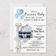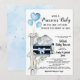 Convite de chá de bebê covid com adorável elefante menino em uma caixa de correio coberta de flores e balões e lindo fundo de aquarela. Este convite de chá de bebê covid é facilmente personalizado para o seu evento.