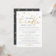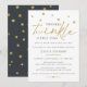 Convite de chá de bebê adorável e fofo com estrelas espalhadas ao longo da parte superior e a palavra "twinkle" em dourado com tipografia serifada moderna. O verso do convite é cinza carvão com estrelas douradas espalhadas.