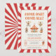 Venha para a celebração mais doce! Este convite de chá de bebê temático de circo apresenta um design vermelho retrô com ilustrações encantadoras de circo, perfeito para dar as boas-vindas à sua pequena estrela. A frase clássica "Venham um, venham todos" prepara o palco para um dia divertido sob o grande toldo.