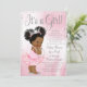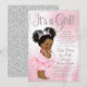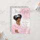 Convite de chá de bebê de princesa africana por correio com adorável bebê princesa com cabelo afro fofo vestindo tutu rosa franzido e coroa prateada com uma corda de pérolas em um lindo fundo rosa e prata. Este convite de chá de bebê por correio é facilmente personalizado para o seu evento, adicionando seus detalhes no estilo de fonte e cor e redação de sua escolha.