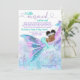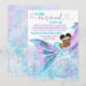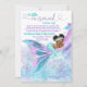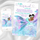 Convites de chá de bebê virtual da sereia africana por encomenda com adorável bebê sereia com cabelo afro fofo e linda cauda azul turquesa dormindo em uma bela cauda de sereia rosa, roxa e azul turquesa e fundo marinho. Este convite de chá de bebê de sereia para longa distância é facilmente personalizado com seus detalhes.