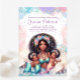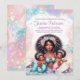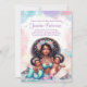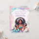 Convites de chá de bebê de sereia gêmea com linda mãe sereia africana segurando dois doces bebês sereia em um lindo fundo de bolhas pastéis e conchas. Este convite de chá de bebê de sereia gêmea é facilmente personalizado para o seu evento, basta adicionar seus detalhes. Você também pode adicionar uma cor de fundo para a frente e para trás.