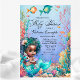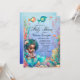 Convite de chá de bebê de sereia africana adorável com pele escura em um lindo fundo submarino. Este convite de chá de bebê de sereia fofa é facilmente personalizado para o seu evento, basta adicionar os detalhes do evento. As palavras Chá de Bebê não podem ser alteradas.