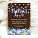 Convite de chá de bebê de churrasco country com um fundo de madeira rústica, luzes de corda de quintal, flores de jardim elegantes em aquarela azul e branca, e um modelo de celebração de chá de bebê de casal que é fácil de personalizar.