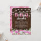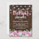 Convite de chá de bebê de churrasco country com um fundo de madeira rústica, luzes de corda no quintal, flores de água em cores rosa e branco elegantes, e um modelo de celebração de chá de bebê de casal fácil de personalizar.