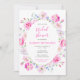 Este convite de chá de noiva em aquarela fofo e caprichoso apresenta flores cor-de-rosa coloridas com folhagem verdejante. O texto combina fontes manuscritas e sem serifa para um visual elegante e moderno. Isso é perfeito para um chá de noiva de primavera ou verão.