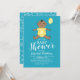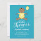 Convites de chá de bebê Little gentleman com um fundo azul brilhante que pode ser alterado para qualquer cor, um adorável bebê menino de desenho animado segurando um balão e um modelo de festa de chá de bebê moderno.