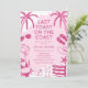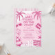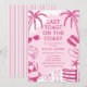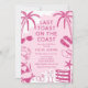 Tire a areia e junte-se a nós para uma festa de noivado que não é nada comum. Esses convites de chá de noiva tropicais e excêntricos são o prelúdio perfeito para uma celebração com tema de praia. Adoráveis desenhos feitos à mão de palmeiras, biquínis, chinelos e mais adornam o design, ao lado do título divertido 'último brinde na costa'. O modelo de texto fácil de personalizar garante que você possa tornar os convites tão únicos quanto o seu evento. Prepare-se para o sol, diversão e todas as memórias que este dia especial certamente trará.