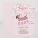 Convite de chá de bebê de menina com tema de dachshund ilustrado com um dachshund fofo vestindo uma camisola rosa, flutuando entre balões macios rosa e bege. Nuvens e estrelas brincalhonas adicionam ao tema caprichoso. O texto divertido 'Um Bebê Pequenino está a caminho' complementa perfeitamente o tema. Este convite certamente trará sorrisos enquanto evoca uma vibração suave e alegre.