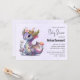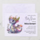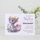 Convite de chá de bebê com uma ilustração de um dragão mítico. Escamas roxas e azuis. Uma coroa de ouro florida com chifres adorna sua cabeça. Mágico, divertido e amigável.